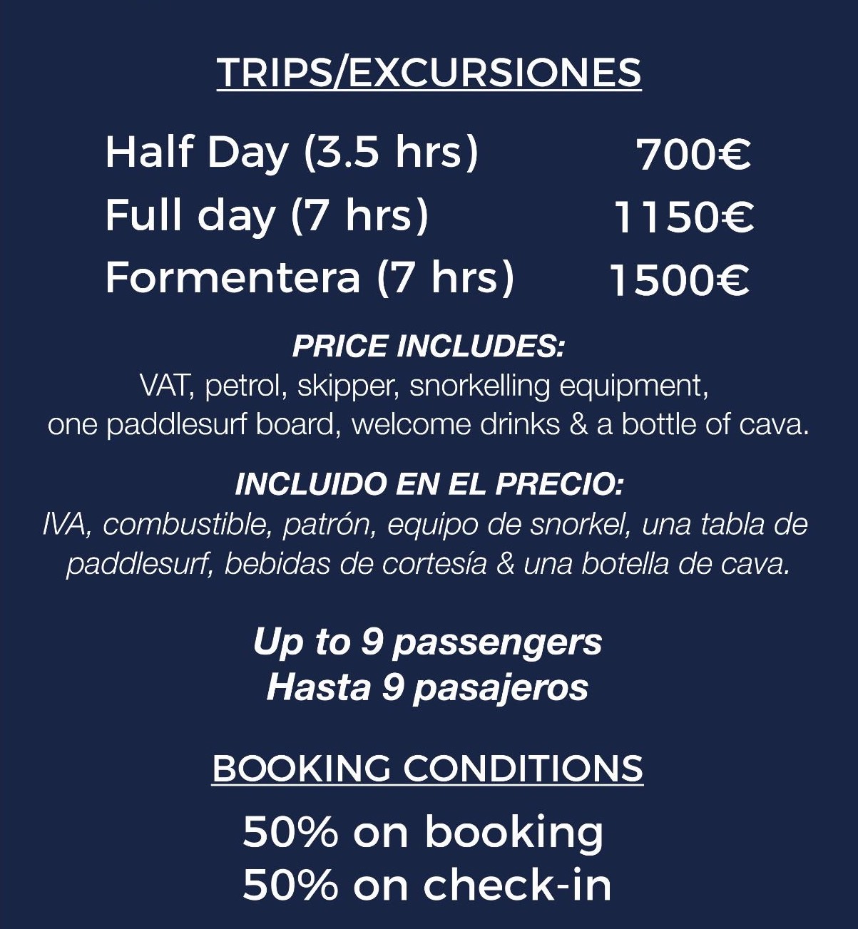 Brandstof inbegrepen tot Es Vedra. Full day Formentera €1500,- all incl.